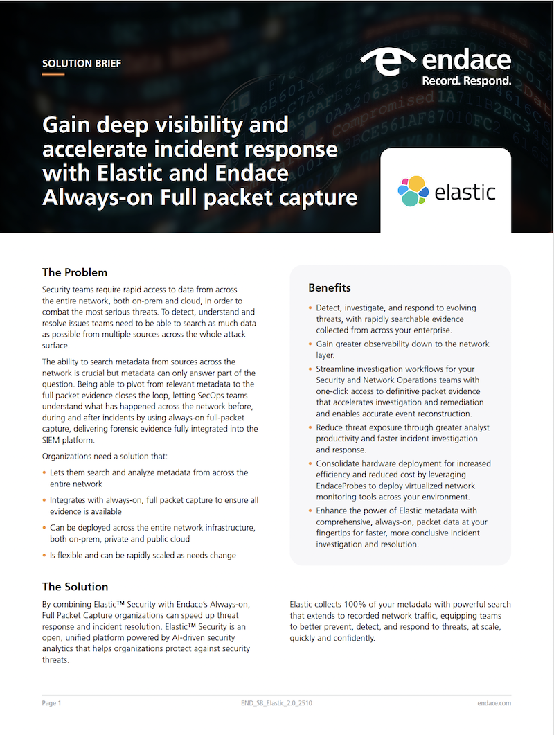 Integrating Elastic with the EndaceProbe's always-on packet capture extends observability, and enables powerful search across weeks or months of continuously recorded network traffic from across your entire enterprise. Having a complete view of all network activity accelerates incident investigation and response.